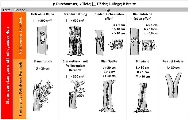 Stammverletzungen entstehen entweder auf natürlichem Weg durch mechanische Einwirkungen wie Steinschlag, Stamm- oder Kronenbruch durch Wind, Eis oder Schnee, aber auch Blitz, Frost oder Waldbrand, oder durch Beschädigungen der Rinde bei der Holzernte. Freiliegendes Holz kann sich über längere Zeit zu einer Höhle weiterentwickeln, falls der Baum die Wunde nicht überwallen kann. Stammverletzungen und freiliegendes Splint- oder Kernholz erleichtern vielen Erstbesiedlern den Zugang zum Holz. Sie sind eine bevorzugte Eingangspforte für Pilze, deren Sporen vom Wind verfrachtet werden. Verletzungen begünstigen auch die Besiedlung des Baumes durch xylobionte Insekten , die sich im freiliegenden Holz entwickeln können.