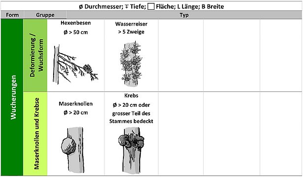 Wucherungen entstehen meist durch reaktives Wachstum infolge eines parasitischen oder mikrobiellen Angriffs, indem der Baum spezifische Strukturen bildet, um den Krankheitserreger zu isolieren (z.B. Krebse, Maserknollen und Hexenbesen). Dazu gehören auch Wasserreiser, die sich nach erhöhter Lichteinwirkung bilden können. Vier Typen gehören zu dieser Form.