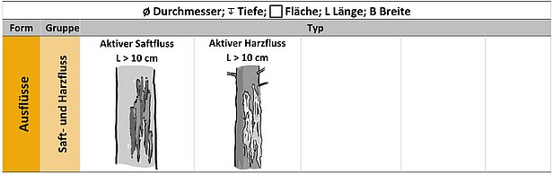 Ausflüsse sind aktive Saft- oder Harzflüsse. Zuckerhaltiger Baumsaft, der aus Wunden herausdrückt, zieht gewisse Käferarten magisch an. Hirschkäfer lecken beispielsweise gerne an diesem austretenden Saft an Eichen. Auch Schmetterlinge profitieren davon. Zudem wachsen bestimmte Flechtenarten bevorzugt an solchen Stellen. Man unterscheidet nur diese beide Typen.