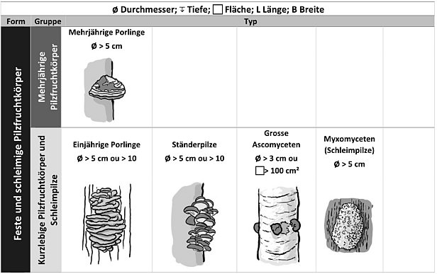 Feste und schleimige Pilzfruchtkörper sind der sichtbare Teil von saproxylischen Pilzen oder pilzähnlichen Organismen wie Schleimpilze (Myxomyceten). Es werden kurzlebige, d.h. weniger als ein Jahr sichtbare, und mehrjährige Fruchtkörper unterschieden. Solche Pilzfruchtkörper können vielen mykophagen Pilzen, die also selbst von Pilzen leben, als Substrat dienen. Auch für viele spezialisierte Insekten stellen Pilzfruchtköroper eine Nahrungsquelle dar. Dies ist etwa beim Baumschwammkäfer (Litargus connexus), beim Rotfleckigen Faulholzkäfer (Tritoma bipustulata) oder beim Schwarzkäfer (Bolitophagus reticulatus) der Fall. Die Fruchtkörper saprophytischer Pilze deuten per se auf eine hohe Artenvielfalt hin, doch begünstigen sie auch andere Waldarten wie Käfer, Dipteren, Schmetterlinge und Motten sowie Rindenwanzen. Insgesamt gehören fünf Typen zu dieser Form.