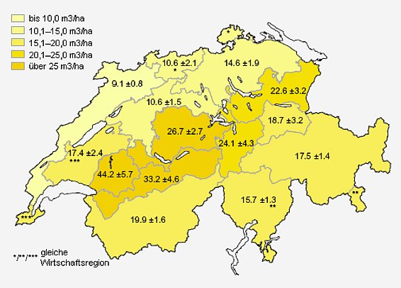 | Totholzvorrat Schweiz (davon stehend, mit Gipfelbrüchen) (davon stehend, ohne Gipfelbrüche) | 18,5 m3/ha (10,8 m3/ha) ( 8,0 m3/ha) |