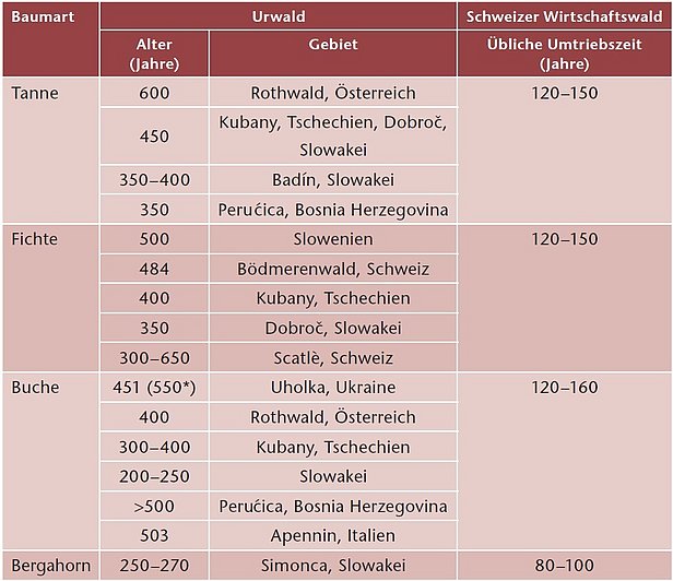 Bäume können sehr alt werden. Bei den üblichen Umtriebszeiten im Wirtschaftswald haben die Bäume erst etwa 25 bis 50% ihrer möglichen Lebenszeit hinter sich, wenn sie gefällt werden. Als ungefähre artenspezifische maximale Altersgrenzen gelten: Eiche 900 Jahre, Fichte, Föhre und Tanne 400 bis 600 Jahre, Bergahorn und Buche 500 Jahre und Lärche 800 Jahre. Gar respektable 1000 Jahre alt sind die ältesten europäischen Eiben, Linden und Arven. Im Bödmerenwald (Schwyz) wurden Fichten von maximal 484 Jahren gefunden, während in Scatlè (Graubünden) das Alter von Fichten auf circa 300 bis 650 Jahre geschätzt wurde. Bütler et al. 2015).